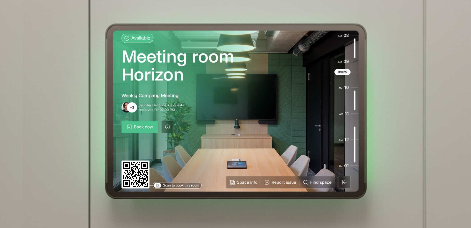 Room displays make the booking process much more visible in the office itself. These are the screens or tablets placed outside meeting rooms that show whether a room is free, booked, or about to become available.