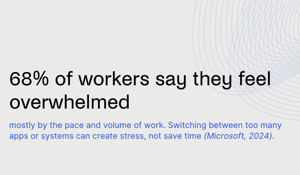 Not all tech makes work easier. In fact, 68% of workers say they feel overwhelmed by the pace and volume of work. Switching between too many apps or systems can create stress, not save time. And when people don’t get proper training, or the tools they use are outdated, it adds frustration.
