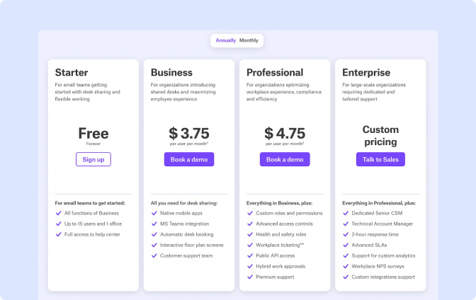 Deskbird has a free plan, and 3 paid plans which, when billed annually, cost: