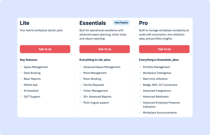 You get the core tools office teams rely on, like desk booking, interactive floor plans, and visitor management, in one platform. But, because of the transparent, resource-based pricing, your costs scale with the number of desks and rooms you manage, not the number of employees. That can be a better fit for teams that are growing headcount faster than their office footprint, or that want to avoid per-user pricing spikes.