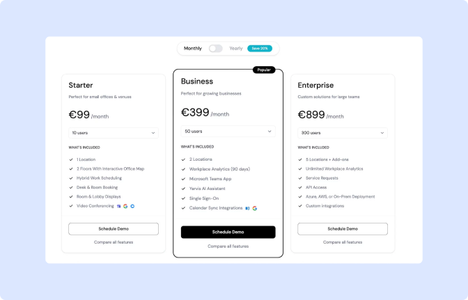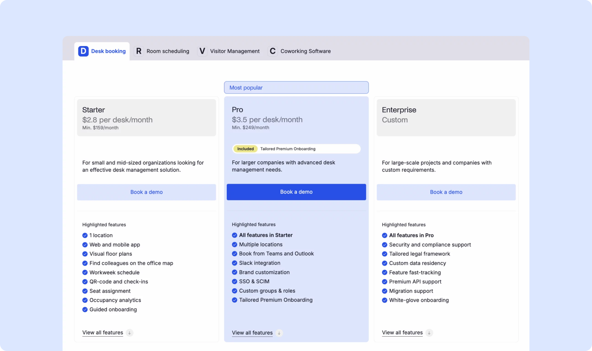 Archie’s pricing starts from $2.8 per desk and $8 per room (minimum $159/month) with Starter. Pro starts at $3.5/desk and $12 per room per month (minimum $249/month), but includes multi-location management, SSO/SCIM, calendar sync, and custom roles.