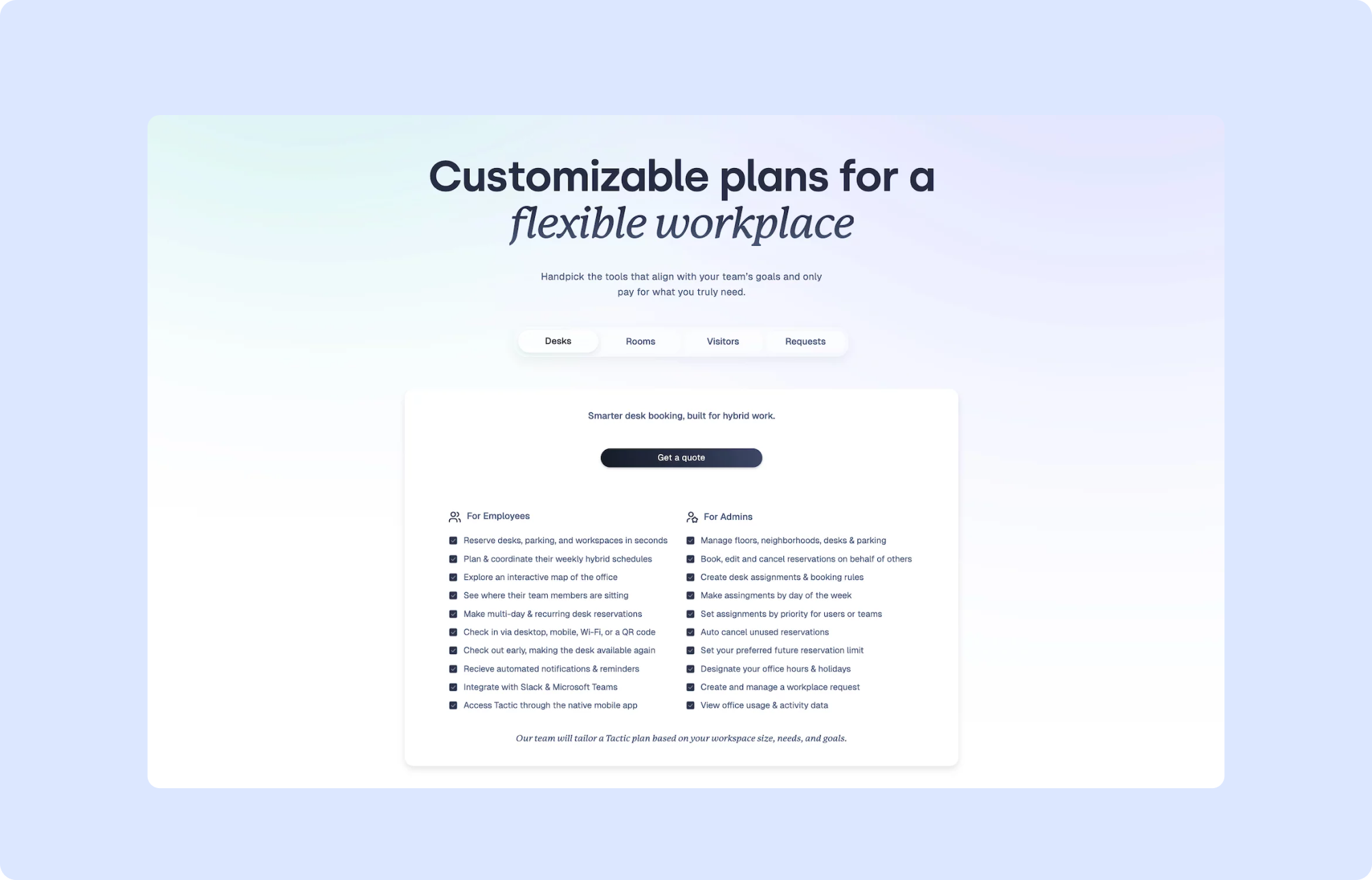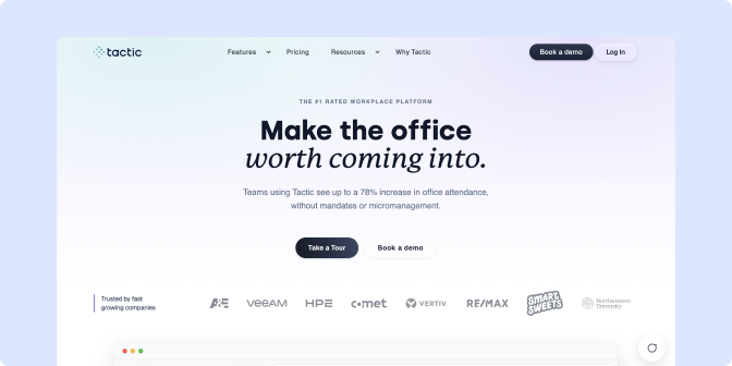 Tactic is best for mid-to-large companies that want comprehensive desk and room booking with strong AI features (Tessa AI) and white-glove implementation. The dedicated onboarding team builds your office maps and handles all setup, making it ideal for busy operations teams.
