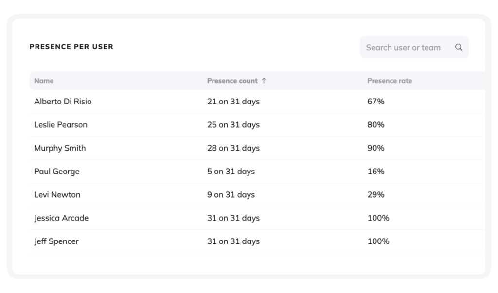 - Total Presence Rate: The percentage of employees working on-site compared to total staff.